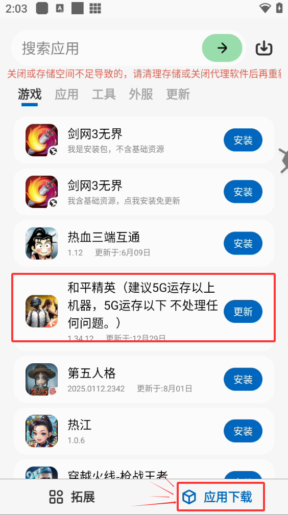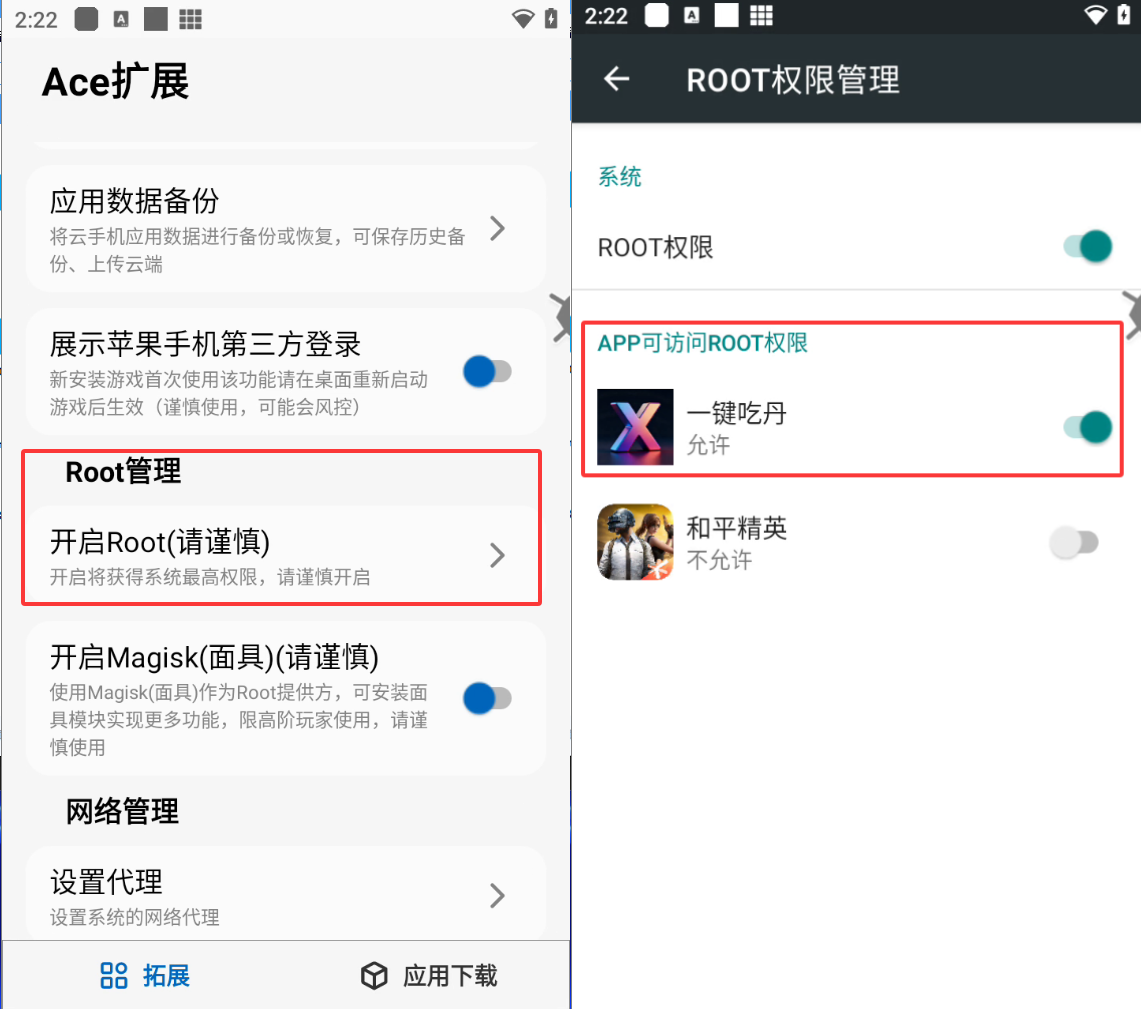 6.安装完成以后,找到应用与拓展,给和平精英和脚本添加进程保活(保护游戏防止闪退)