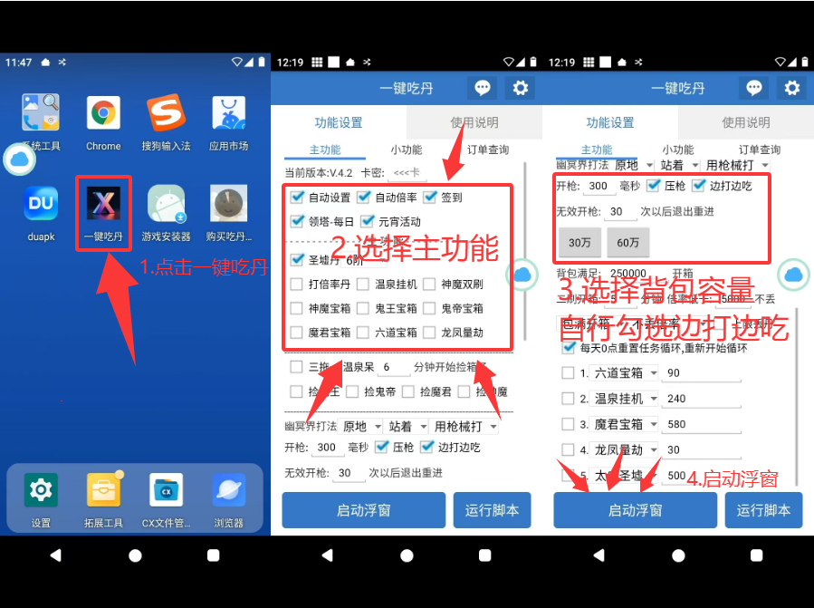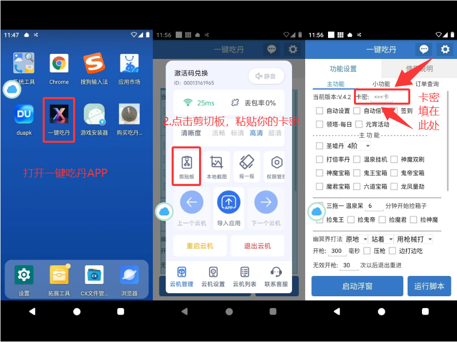 设置好root权限,打开桌面上的一键吃丹APP,粘贴填入你的卡密,选择脚本的主功能