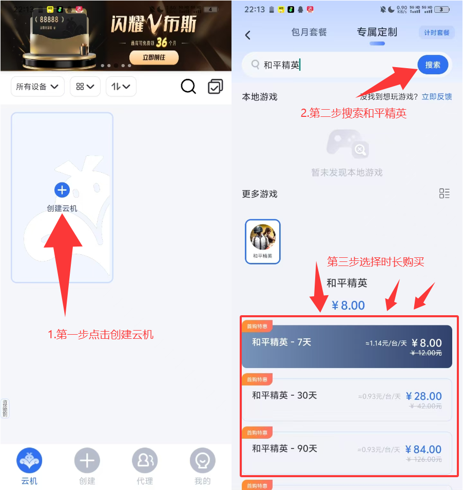 先通过上方链接去注册云机,注册后去购买云机【和平精英】
