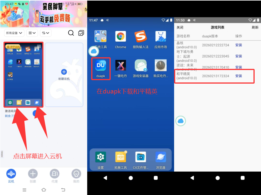 购买后返回主页面,找到你的云机,点击屏幕进入,下载游戏