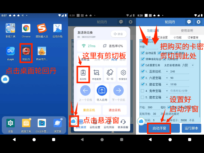 4.打开你的脚本,填入卡密(云机的小云朵悬浮窗,里面有剪切板可以粘帖),设置你要执行的功能,